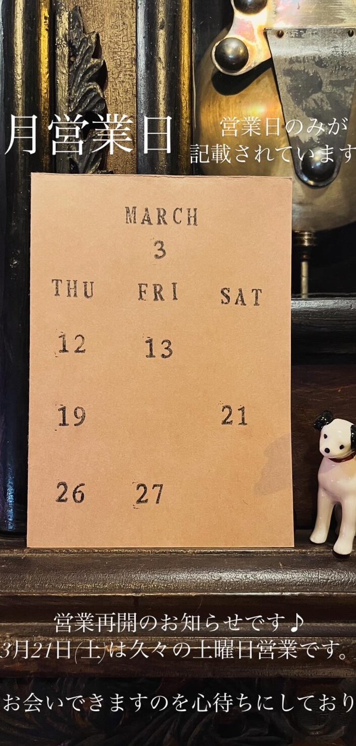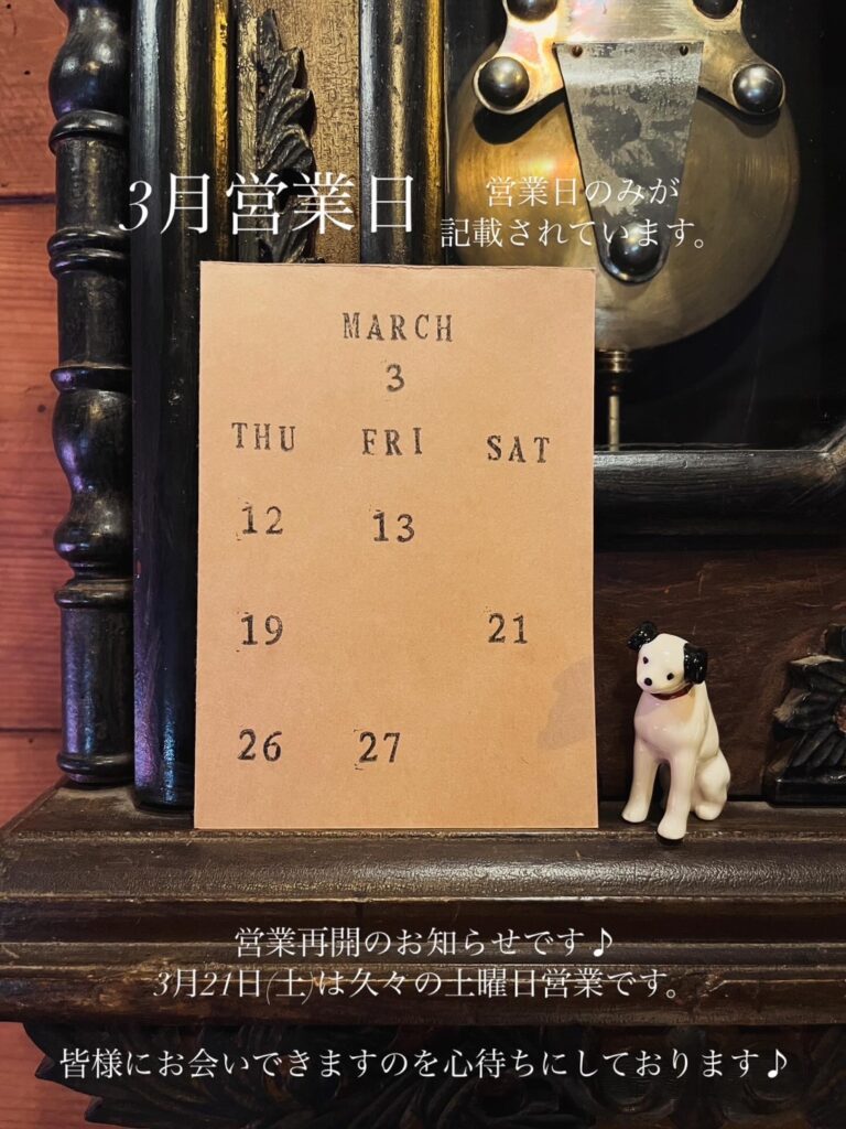 3月の営業日のお知らせです。カレンダーには営業日のみが記載されています。