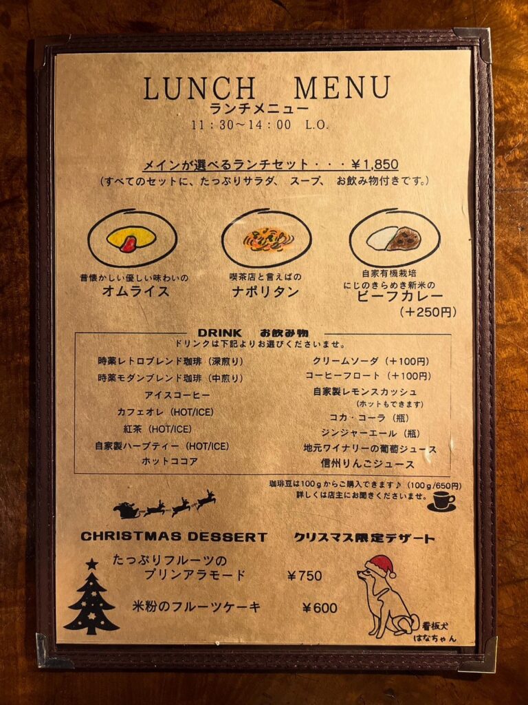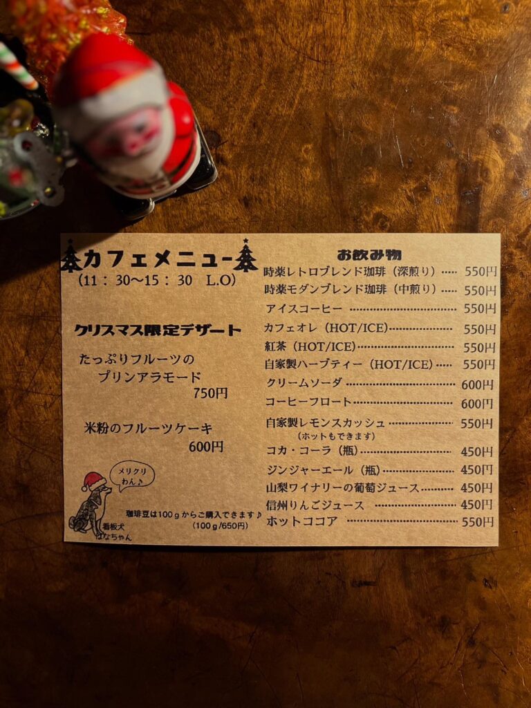11月20日より、クリスマス限定デザートが始まりました。喫茶店の固めのプリンがクリスマス仕様の『たっぷりフルーツのプリンアラモード』としてお楽しみいただけます。ケーキは洋酒とスパイスが香る米粉のグルテンフリーなフルーツケーキです。香り高い時薬ブレンド珈琲やその他ドリンクと共にどうぞお楽しみください。